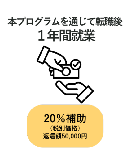 本プログラムを通じて転職後、1年間在籍が確認できた方には、さらに受講料(税抜き価格)の20%を補助